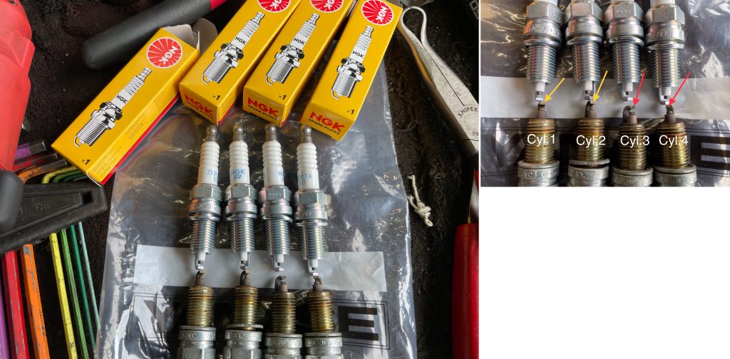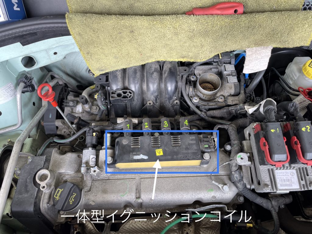 現車のイグニッションコイルは4気筒分が一体となっています。このコイルを外し、スパークプラグを交換します。