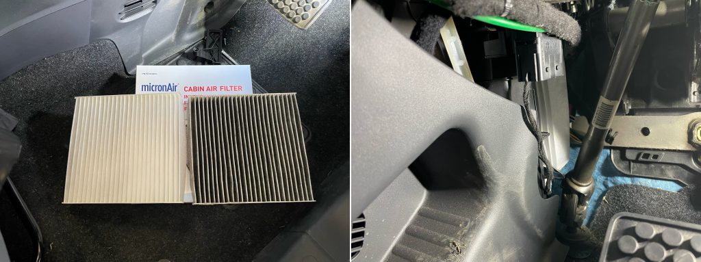 エンジンルームの作業は完了。次は忘れがちなエアコンフィルターの交換です。現車のエアコンフィルターはヒーターボックスの下に取付けされています。