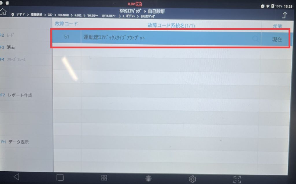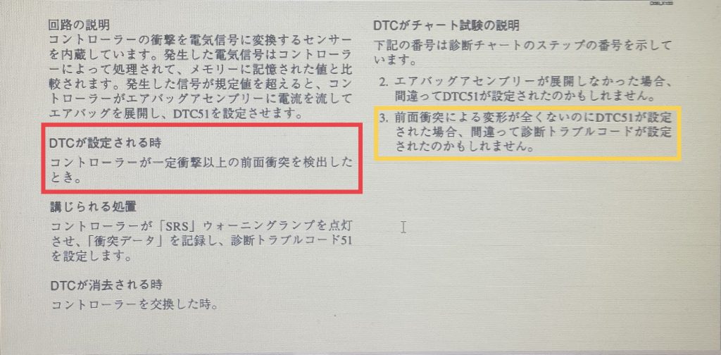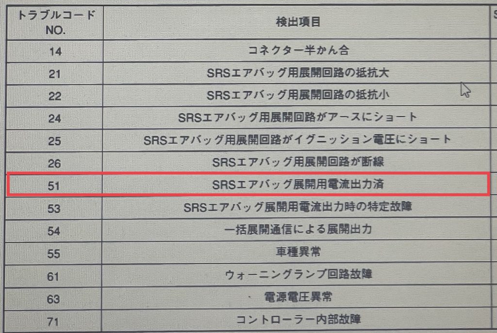整備書を確認すると、コード51はエアバッグが展開してしまった時に入力されるコードでした。しかし、現車は衝突した訳ではありません。