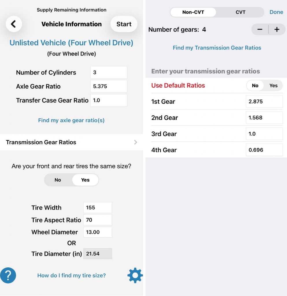 アプリに収録されている車種は北米車が主ですが、エンジンのシリンダー数、駆動方式、タイヤサイズ、トランスミッションのギヤ比、ディファレンシャルギヤのギヤ比を入力すれば、国産車の診断にも使えます。